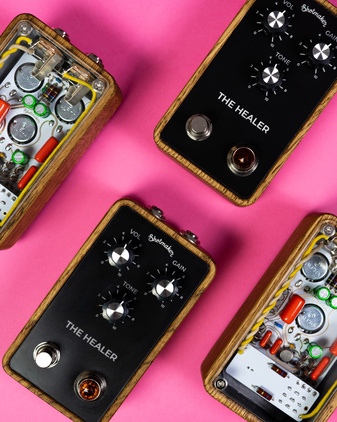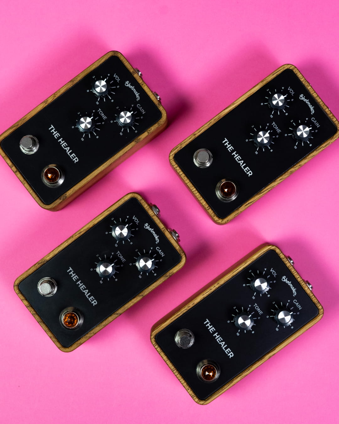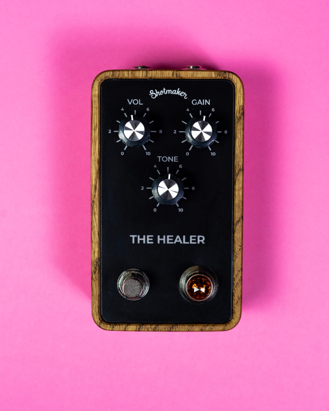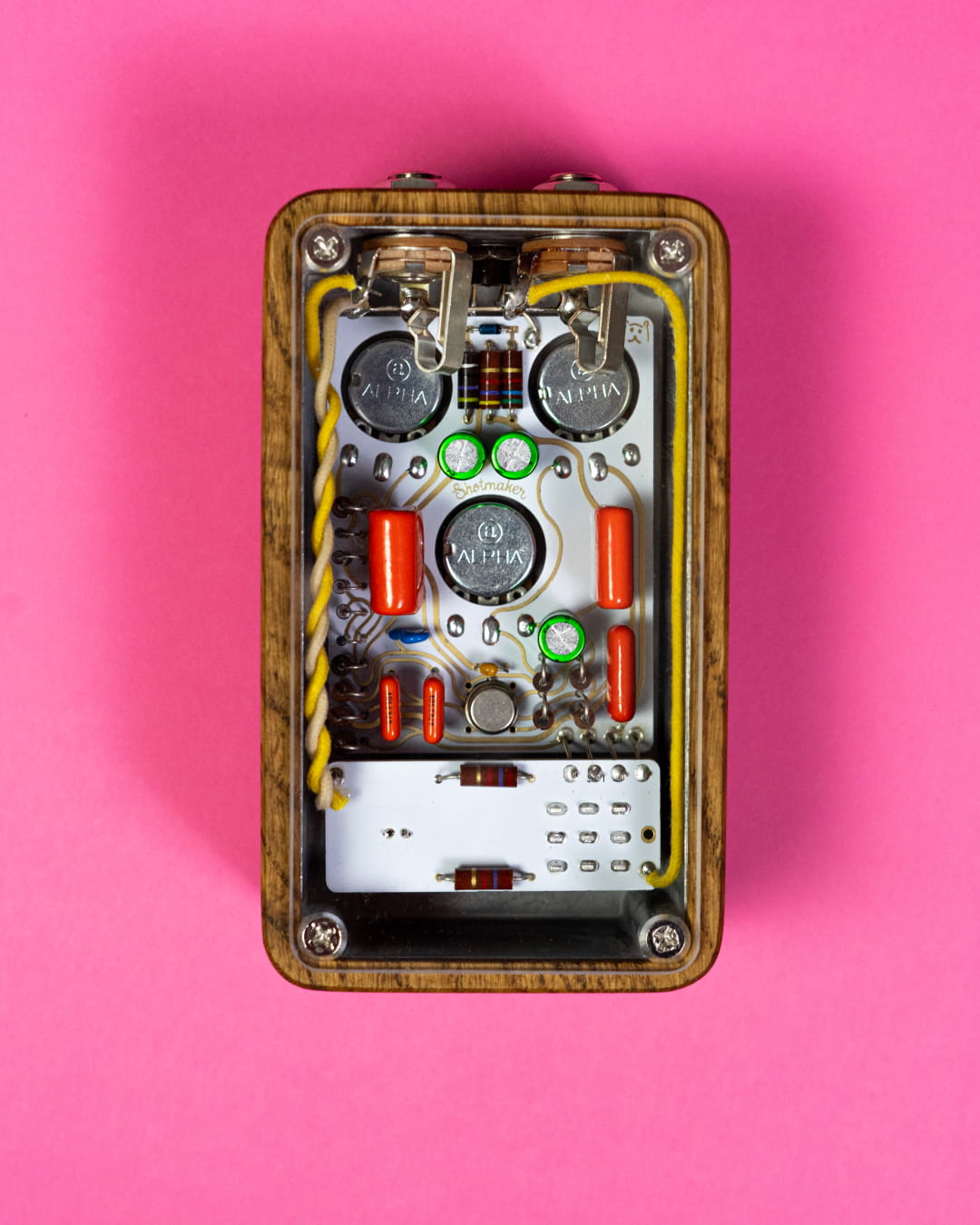 The Heroine Preamp utilizes two internal circuits to recreate amp-like overdrive. A preamp circuit with MOSFET hardclipping feeds into a silicon transistor based master circuit.